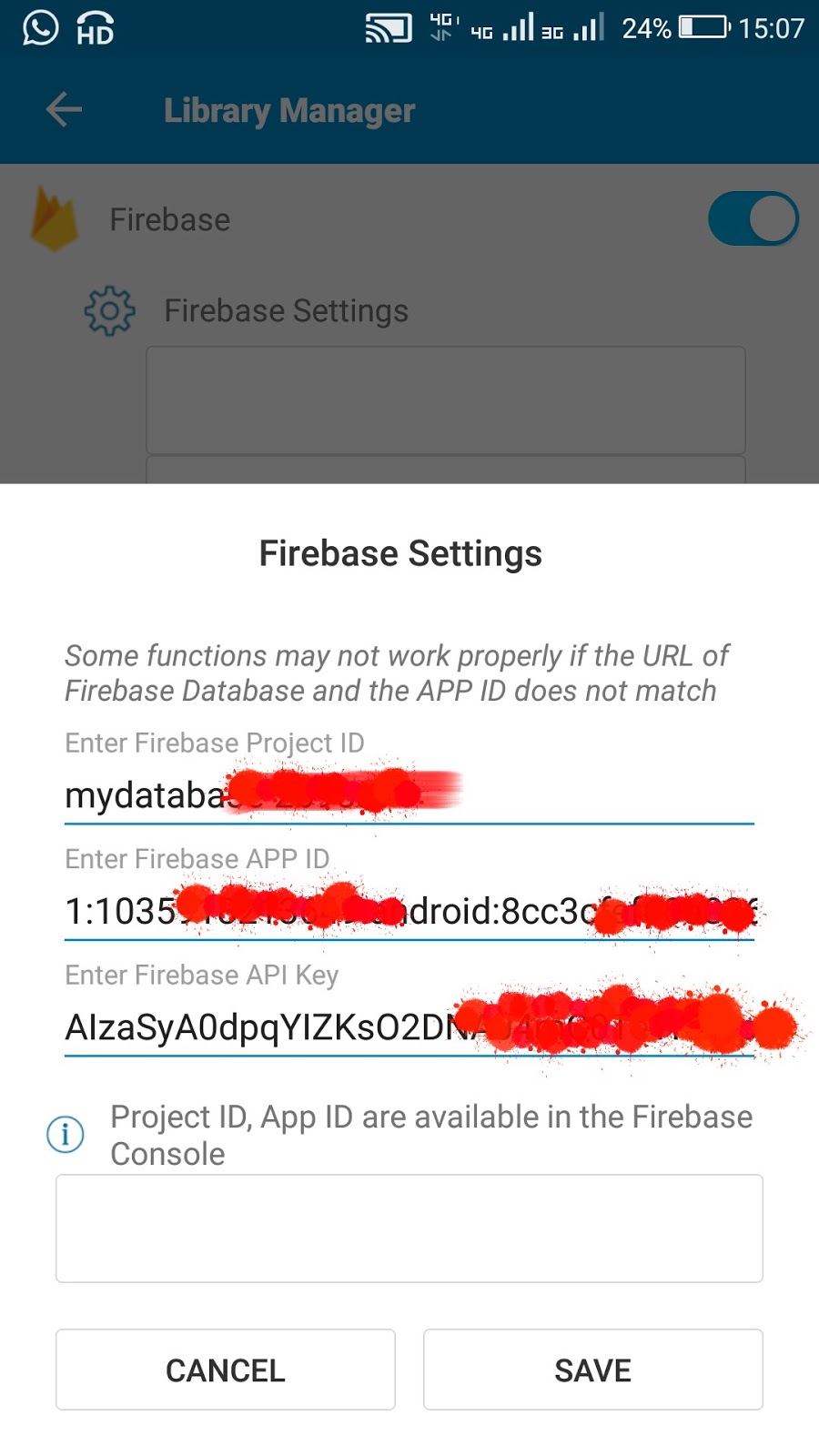 4. Paste the Project ID, App ID, and Web API Key in your project in Sketchware, in the Firebase settings.